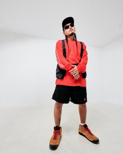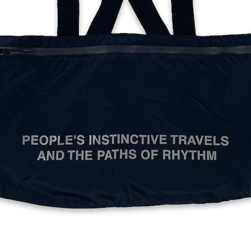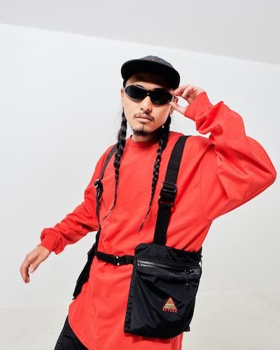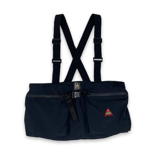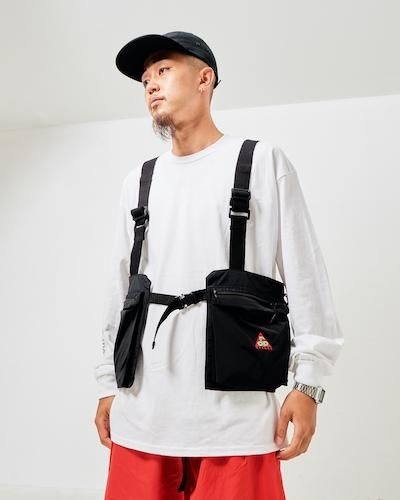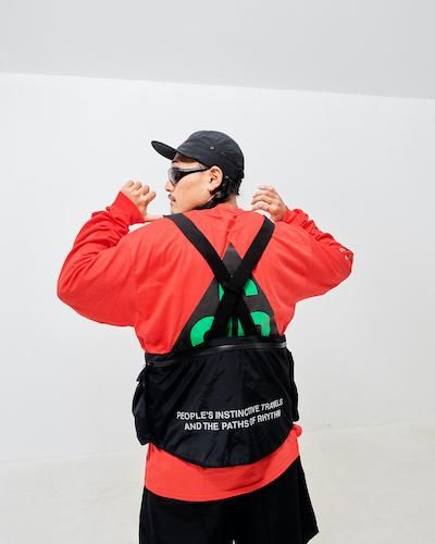 某スポーツメーカーのアウトドアラインをサンプリングしたロゴをフロントには刺繍を施し、バッグには90年代を代表するグループ、ATCQのデビューアルバムのタイトルをリフレクター(暗闇で光に反射するインクです)でプリントしたベストです。