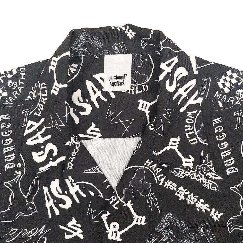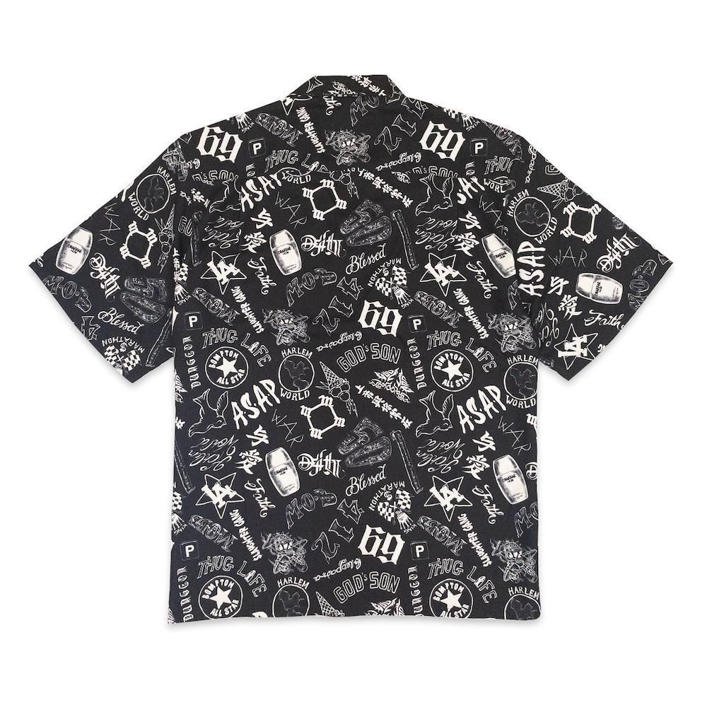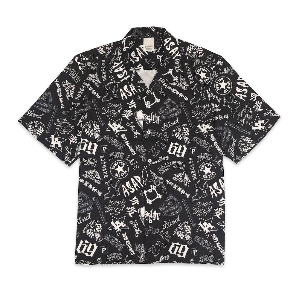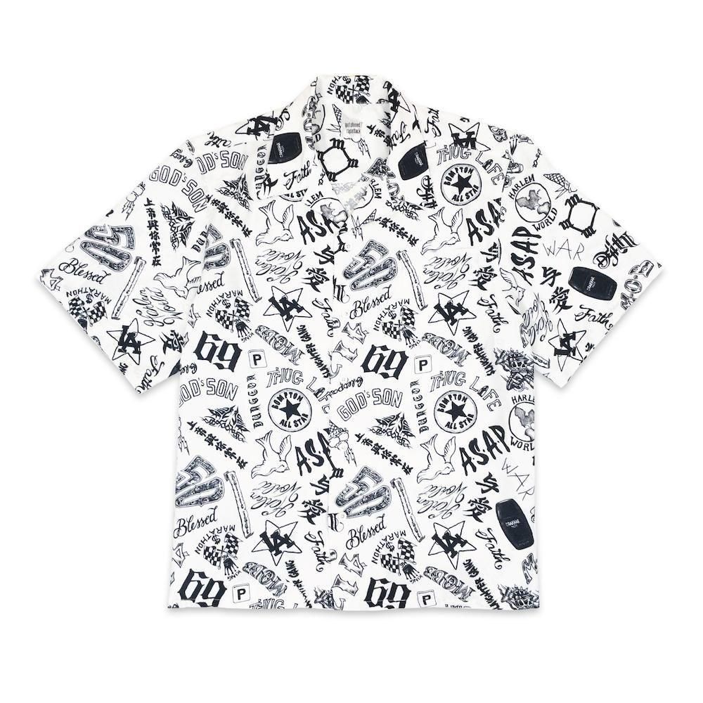 古今東西のラッパーの印象的なタトゥーをコラージュ、しわになりにくいポリエステル100%の生地にプリントしたハーフスリーブシャツです。