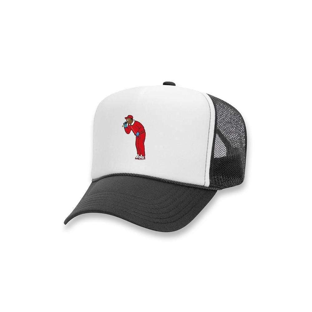 80年代に某音楽雑誌の表紙を飾った消しゴム版画家によるLL COOL Jのイラストを、タイラー・ザ・クリエイターに置き換えたメッシュキャップです。